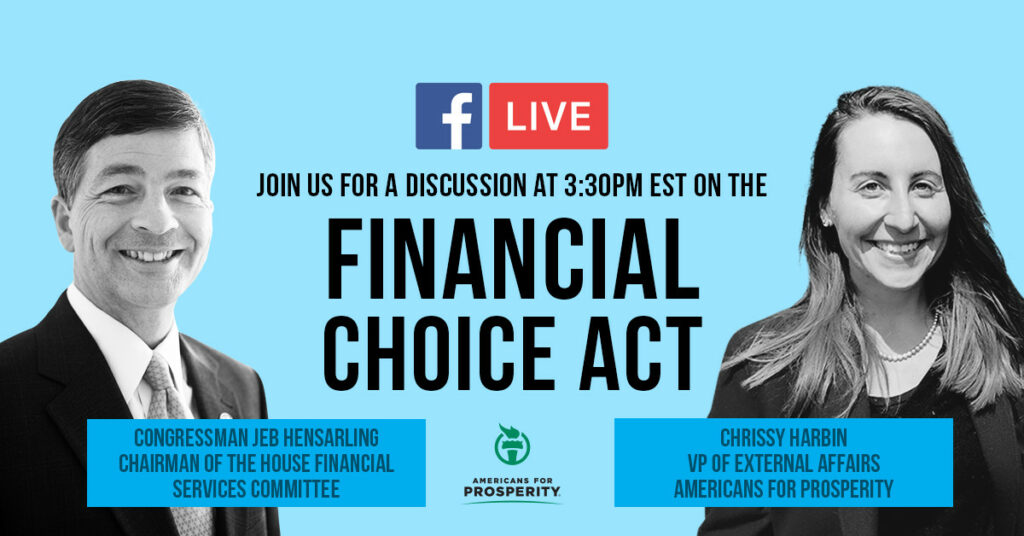 “I’m excited to be joining Americans for Prosperity for an exclusive discussion about the Financial CHOICE Act and why this legislation is so critical to reducing the burdensome regulations currently restricting business creation, innovation and entrepreneurship. The Financial CHOICE Act is a market driven solution to many of the onerous regulations that have caused community banks to close their doors, and consumers’ credit choices and options to dry up as a result of the Obama Administration’s Dodd-Frank Act. We appreciate AFP’s support for this effort and look forward to discussing this bill and the upcoming vote this week.”
