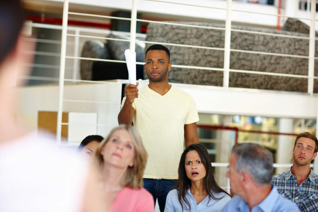 Shot of an unhappy man asking a question during a presentation at work