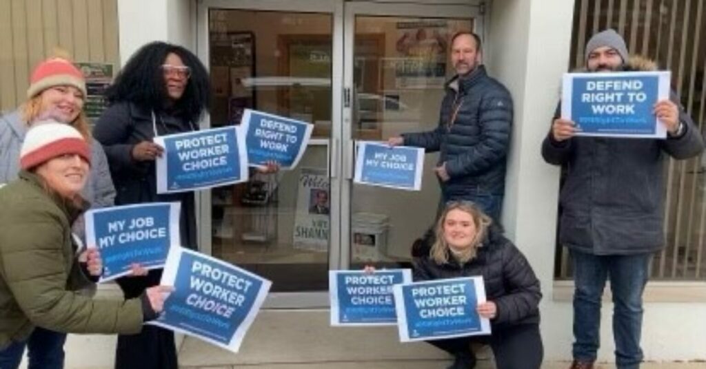 Holding signs reading “My Job, My Choice” and “Protect Worker Choice,” protestors voiced their opposition to legislation sponsored by Rep. Shannon that would repeal Michigan’s Right to Work law.