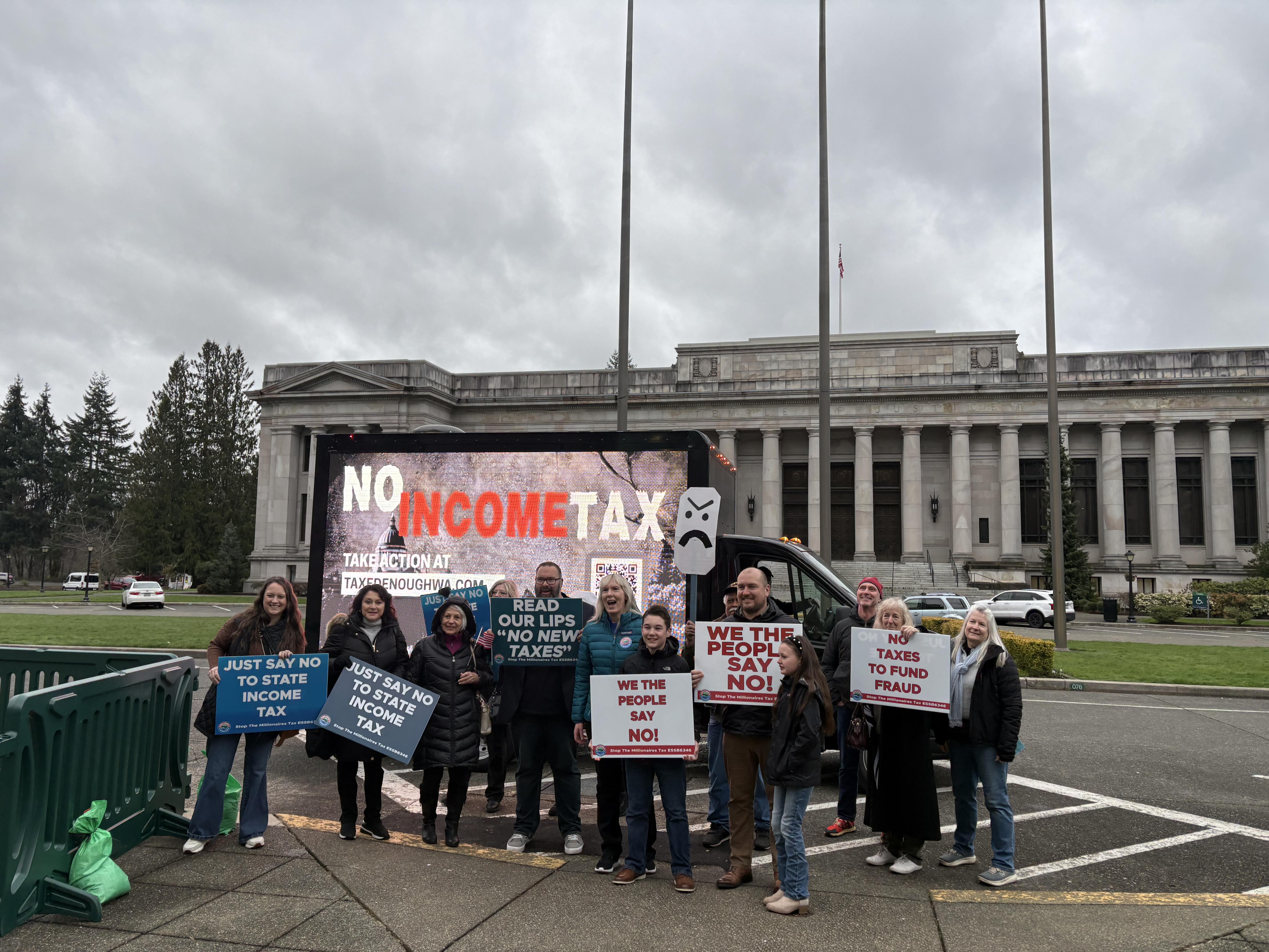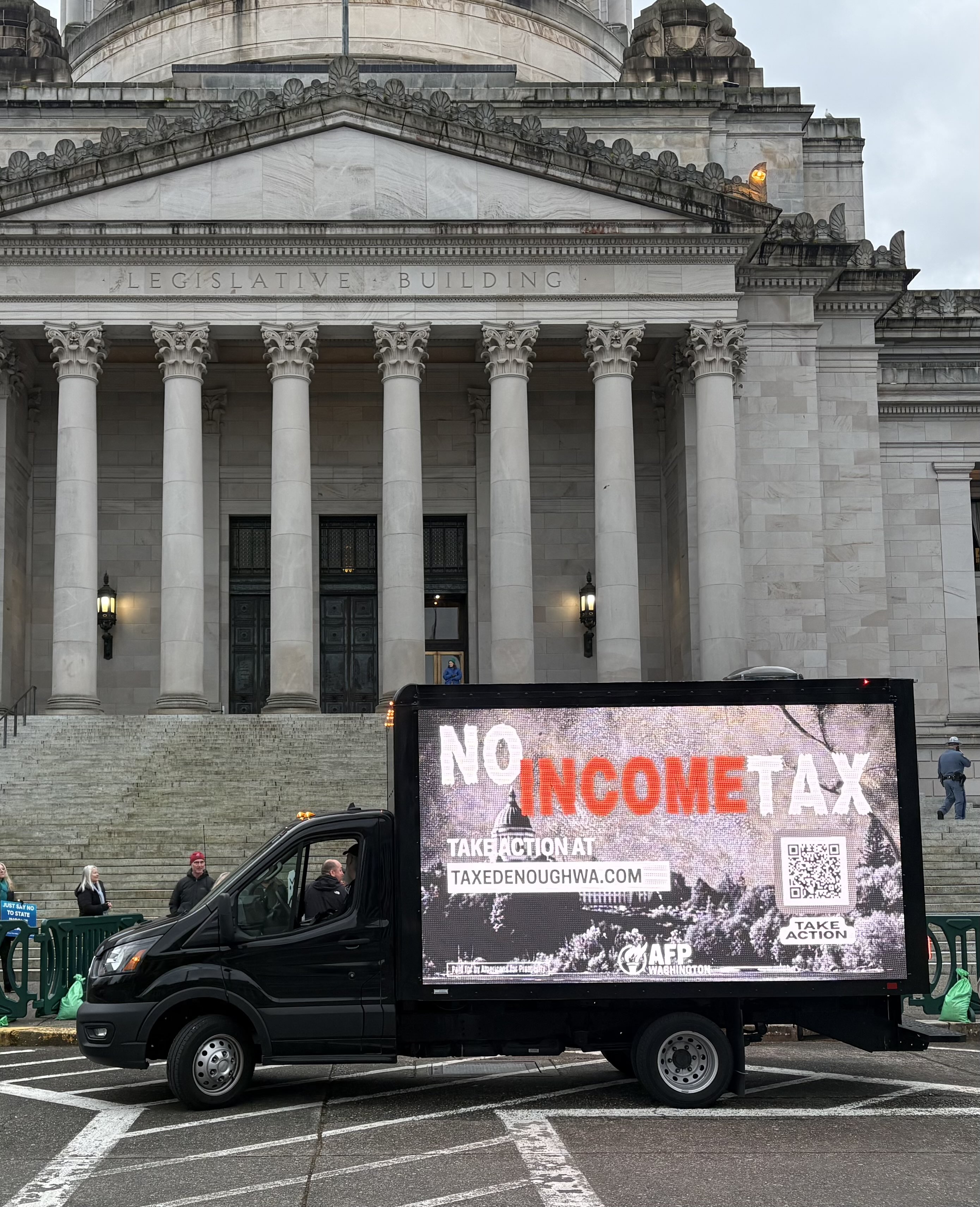 In addition to delivering testimony, AFP joined Washingtonians outside the capital to voice strong opposition to the proposal. An LED billboard truck also circled the capital campus throughout the day, amplifying the message and urging lawmakers to reject the measure.