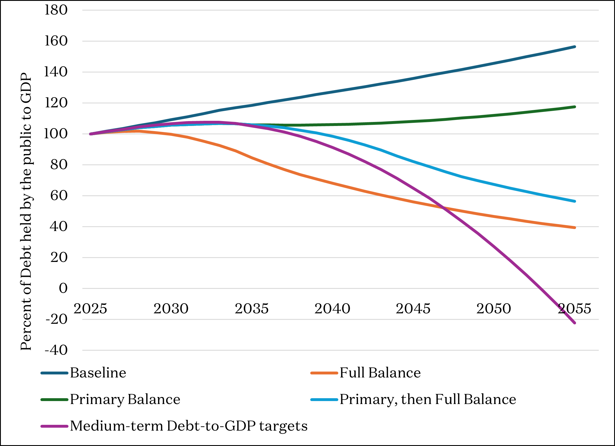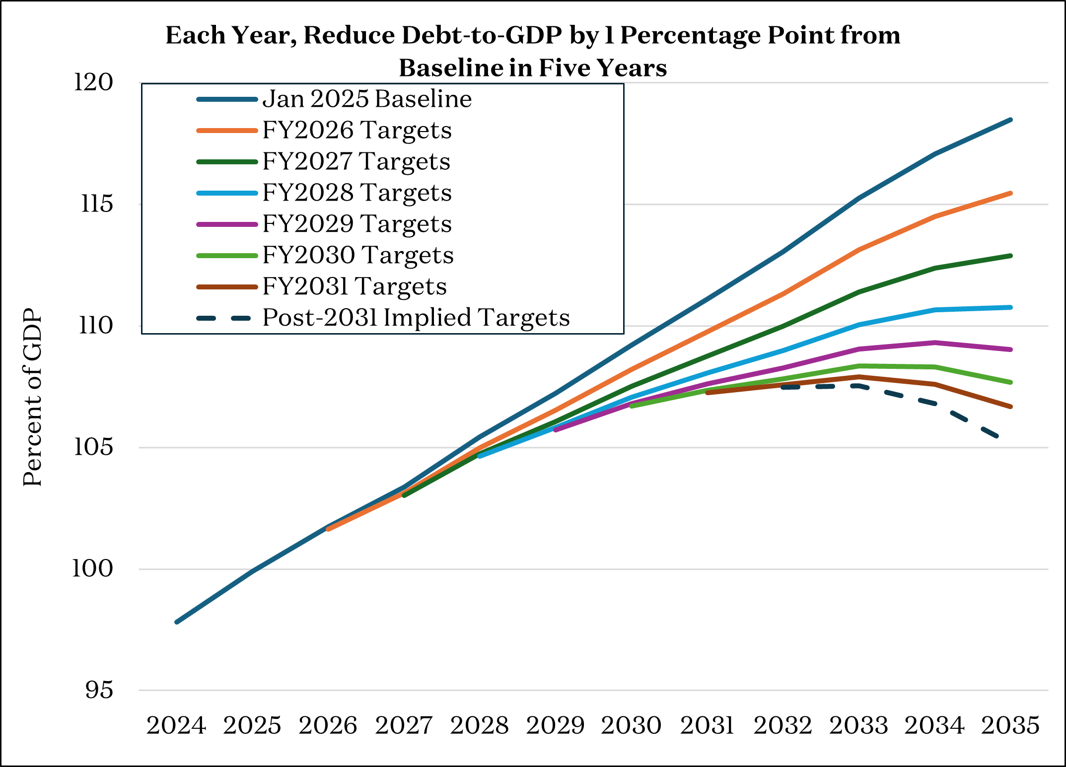 Figure 1 illustrates repeatedly meeting modest medium-term debt-to-GDP targets. Each year, Congress would reduce the debt-to-GDP ratio after five years to one percentage point lower than the latest projection. Any combination of spending restraint, revenue, and economic growth could contribute. The debt would stabilize and start to decline within a decade.