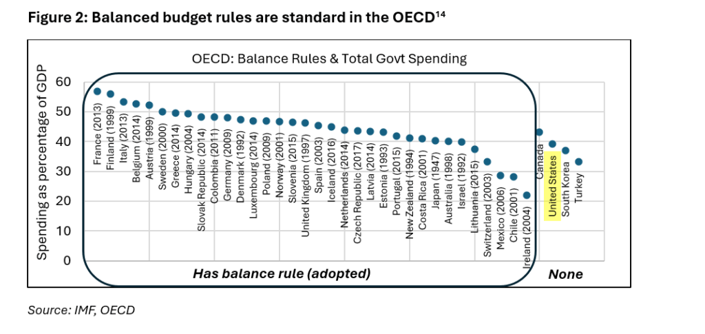 Most economically advanced countries must balance their budgets as well (Figure 2). Like U.S. states, they have used policy changes and institutional upgrades to reduce budget pressures. The rules vary but usually have constitutional provisions with details in statute. Notably, countries with balanced budget rules tend to have stable or declining debt burdens except during emergencies but different visions for the size and scope of government.