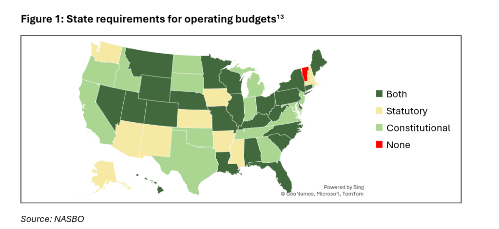 [13] National Association of State Budget Officers, Budget Processes in the States, 2021, Table 9: Balanced Operating Budget Requirements, p. 61.