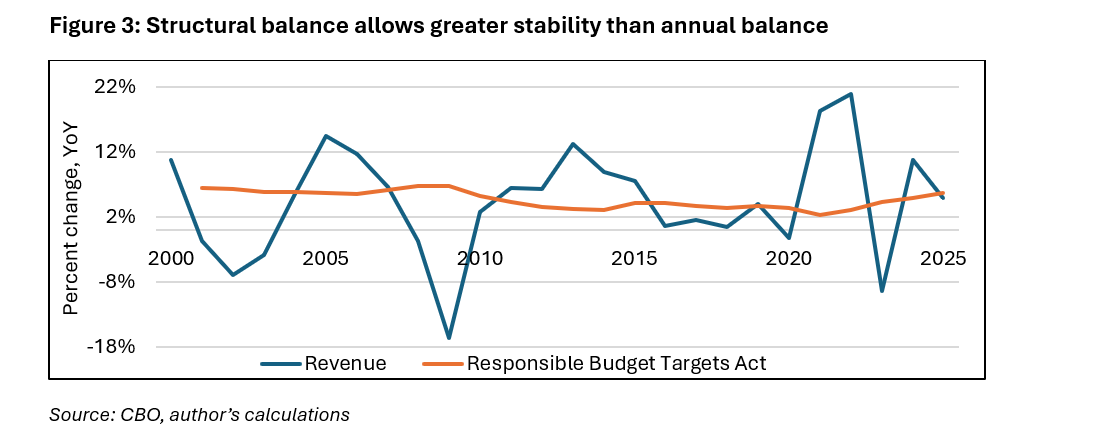 The American people overwhelmingly support a BBA. A 2023 poll found that 80 percent of Americans support “a constitutional amendment that would require a balanced budget within 10 years.”[15] Many economists have cautioned, however, that balance should be over the business cycle rather than every year.[16] Revenue is volatile, but smoothing spending over the medium term can harmonize policy stability with the rule of law (Figure 3).