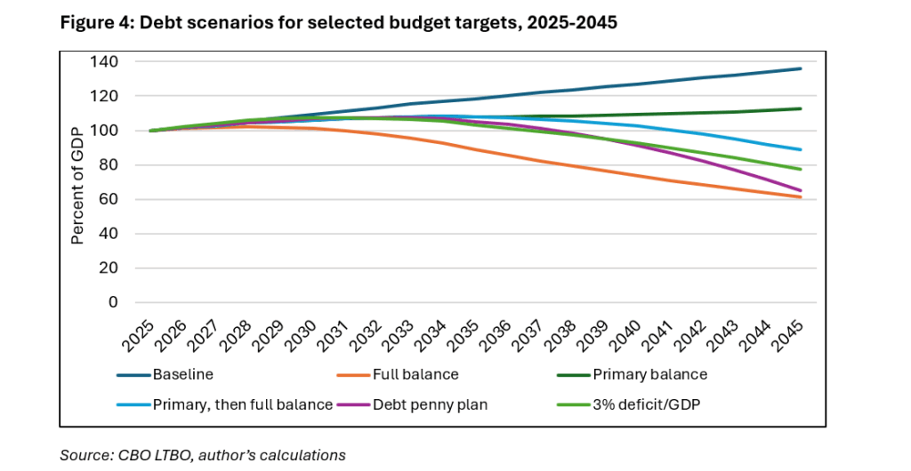 A 10-year glide slope to primary balance is consistent with recent calls for a 3-percent-of-GDP deficit target and at least one way to implement Rep. Tom McClintock’s proposed debt limit amendment (Figure 4).[22] A path to primary balance would nearly stabilize the debt-to-GDP ratio in a decade, and Congress could later target primary surpluses to reduce debt drag further.